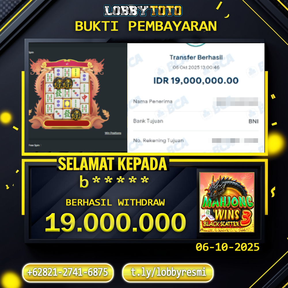 Selamat Kepada Member LOBBYTOTO dengan USER ID b**** BERHASIL WITHDRAW Rp. 19.000.000.