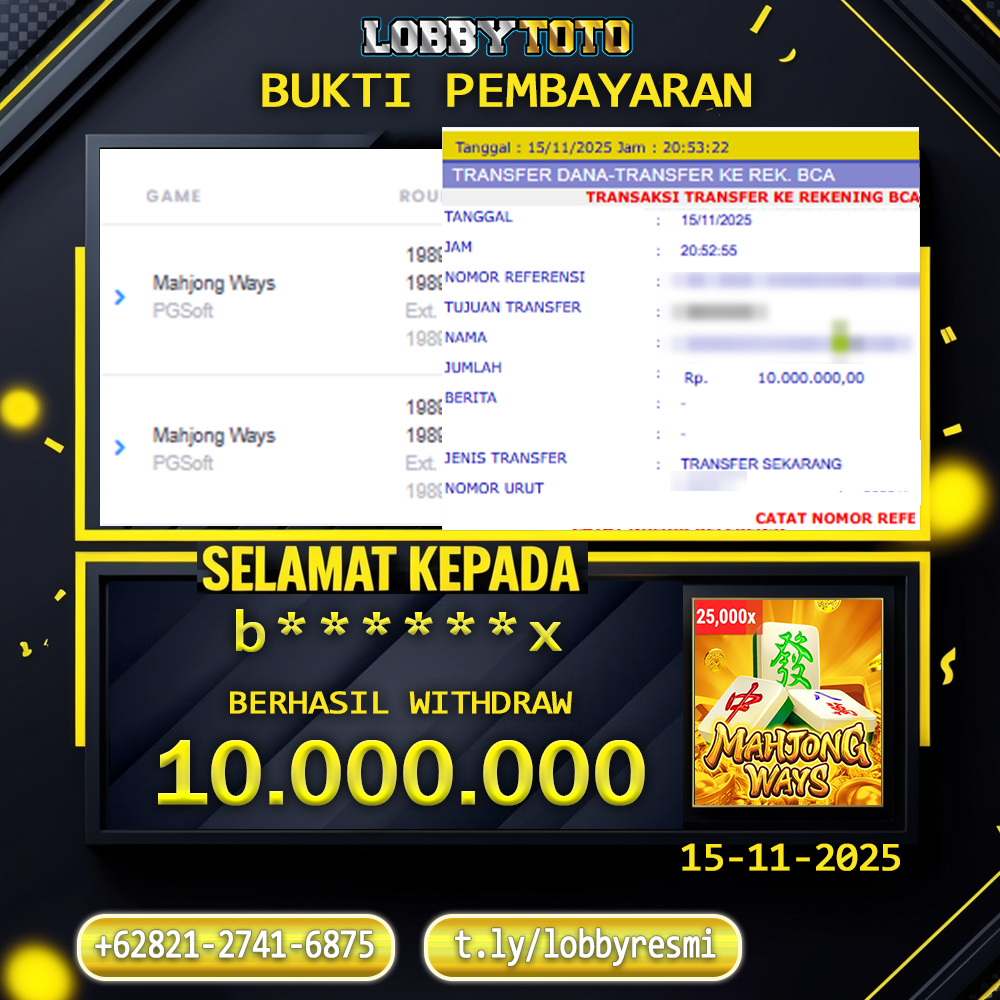 Selamat Kepada Member LOBBYTOTO dengan USER ID b****x BERHASIL WITHDRAW Rp.10.000.000.