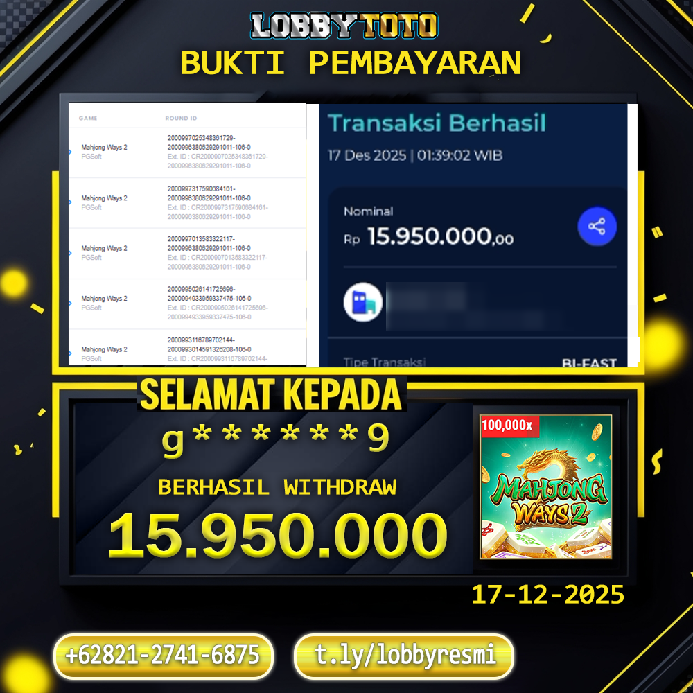 Selamat Kepada Member LOBBYTOTO dengan USER ID g***9 BERHASIL WITHDRAW Rp. 15.950.000.