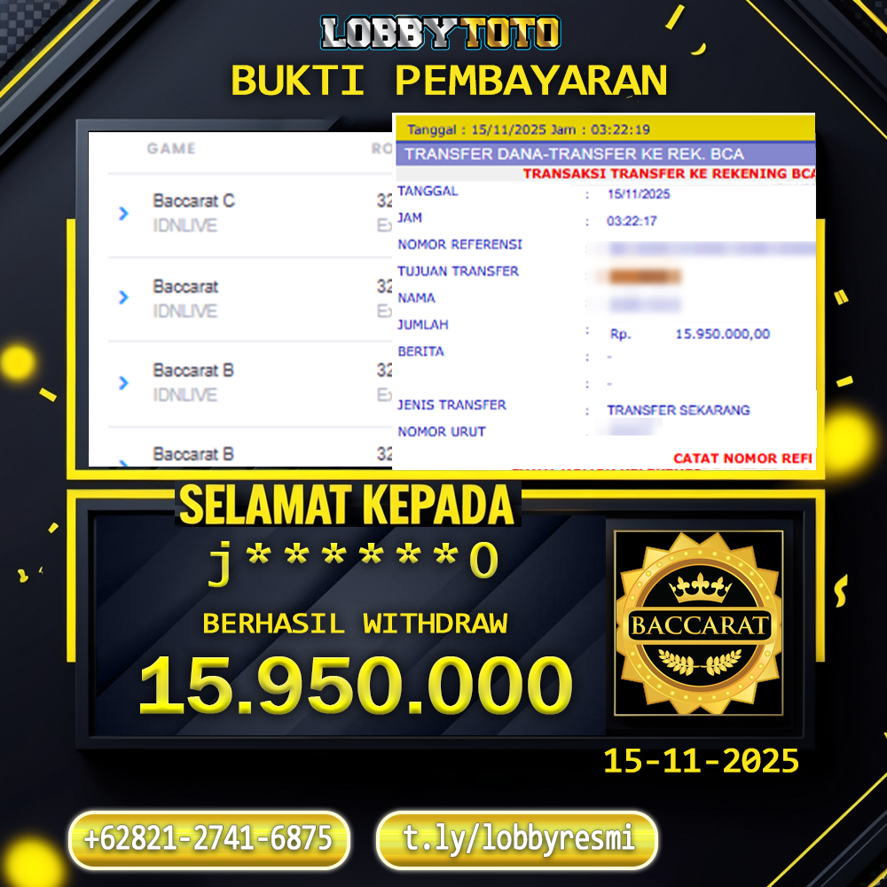 Selamat Kepada Member LOBBYTOTO dengan USER ID j****0 BERHASIL WITHDRAW Rp.15.950.000.