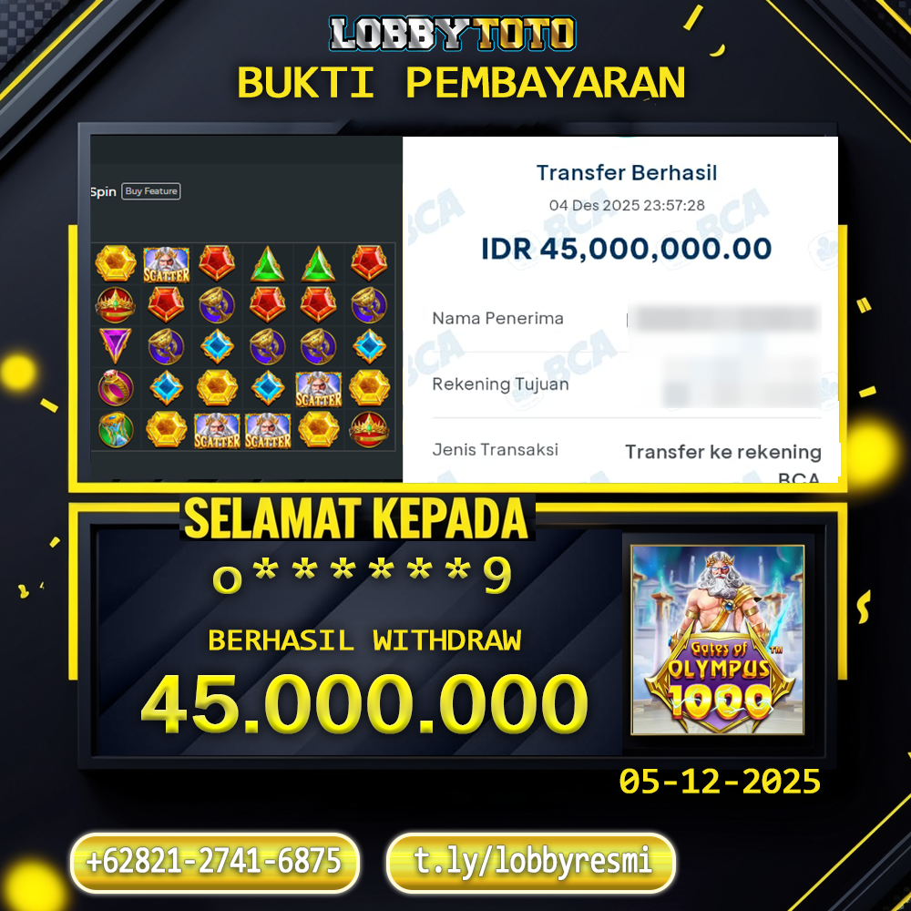 Selamat Kepada Member LOBBYTOTO dengan USER ID o****9 BERHASIL WITHDRAW Rp. 45.000.000.