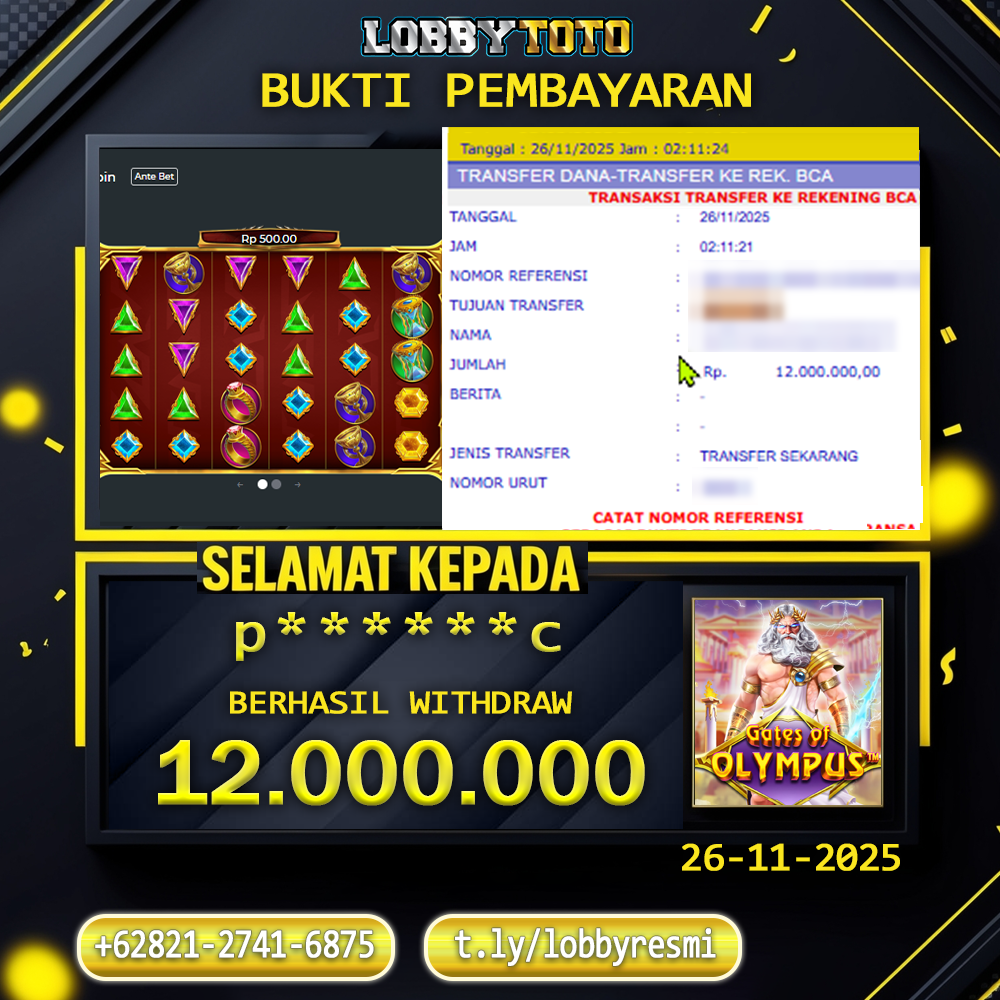 Selamat Kepada Member LOBBYTOTO dengan USER ID p****c BERHASIL WITHDRAW Rp.12.000.000.
