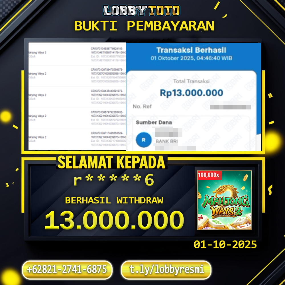 Selamat Kepada Member LOBBYTOTO dengan USER ID r***6 BERHASIL WITHDRAW Rp. 13.000.000.